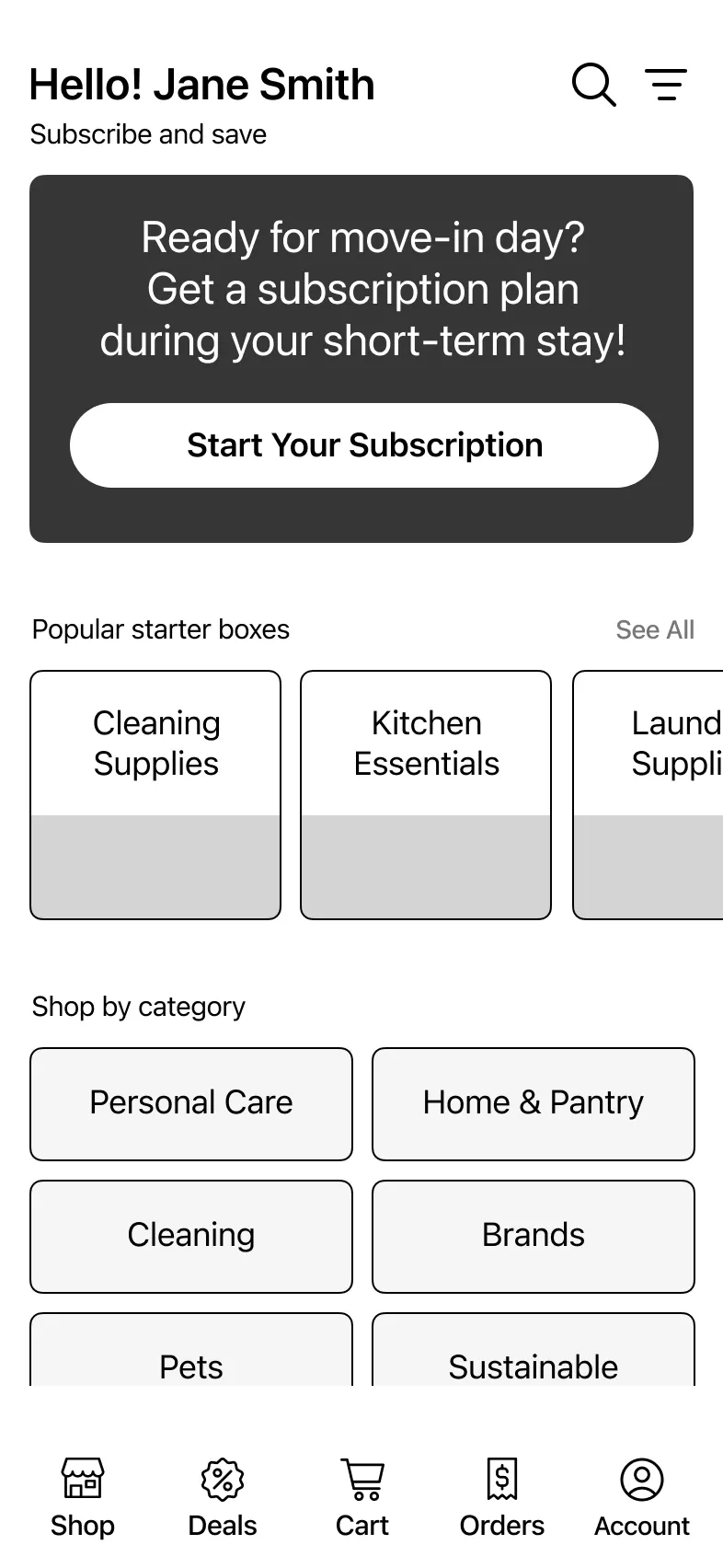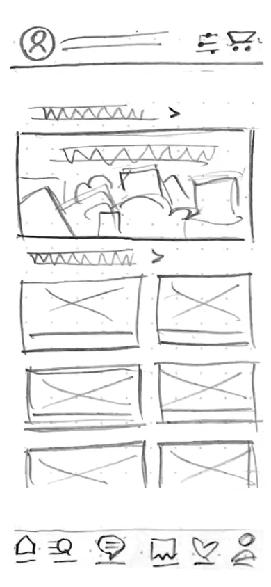 The store landing screen evolved from a basic structural layout into a more guided entry point, with stronger hierarchy and clearer visual separation across featured content and categories.
