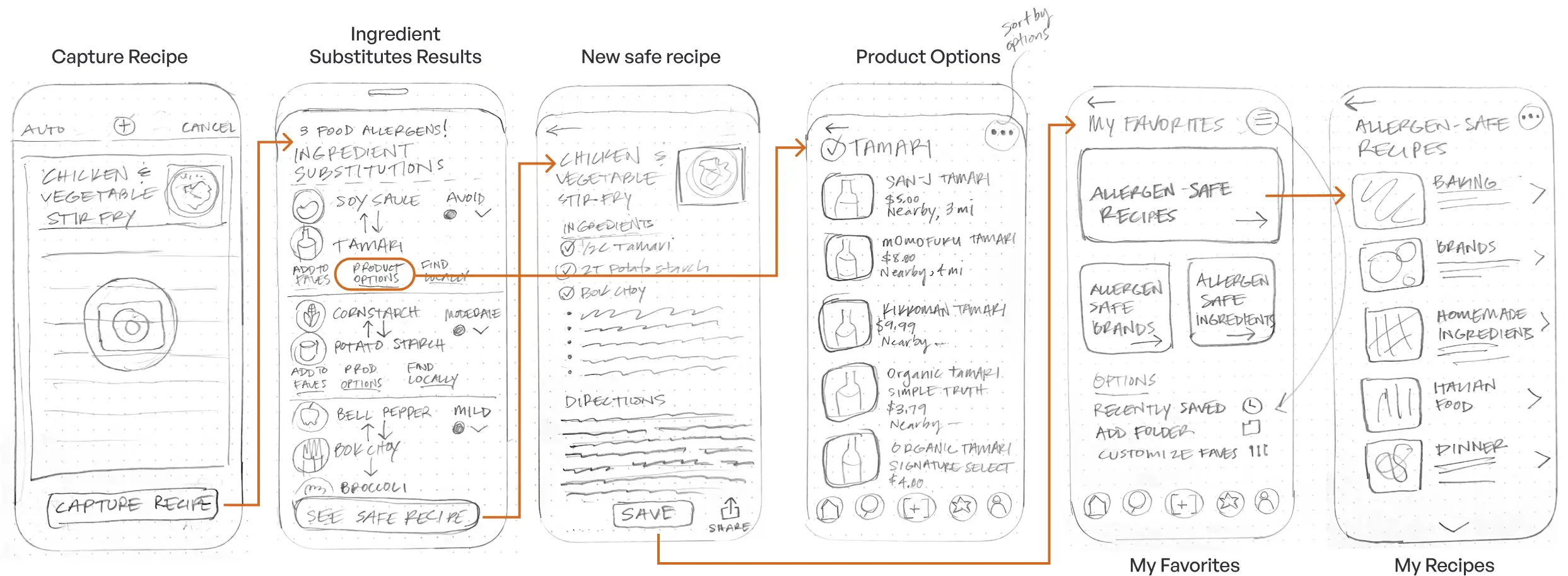 Research revealed that managing food allergies isn’t just about avoiding ingredients, it’s about navigating limited meal options and a lack of trust in existing tools. To translate these insights into actionable design decisions, I grounded the solution around a representative user and mapped the challenges they face throughout the cooking journey.